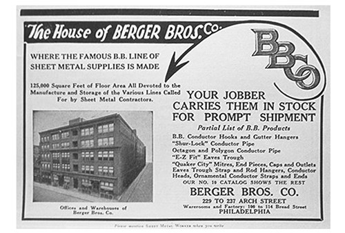 The Berger Brothers Company was founded in 1874 as a supplier of sheet metal and roofing materials. At one point, the company had its offices and warehouse and 229 Arch St. in Old City. The company is still in existence today, but no longer occupies the space in Old City.