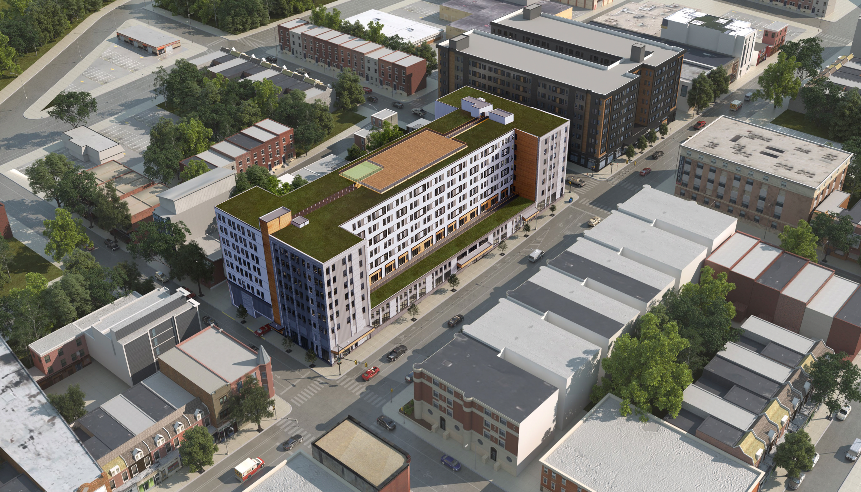 The project entails a 7-story, 189,000 square foot building that will include 275 residential units, 30,300 square feet of ground floor commercial space, 75 underground parking spots, 113 bicycle stalls, a green roof, and a roof deck.