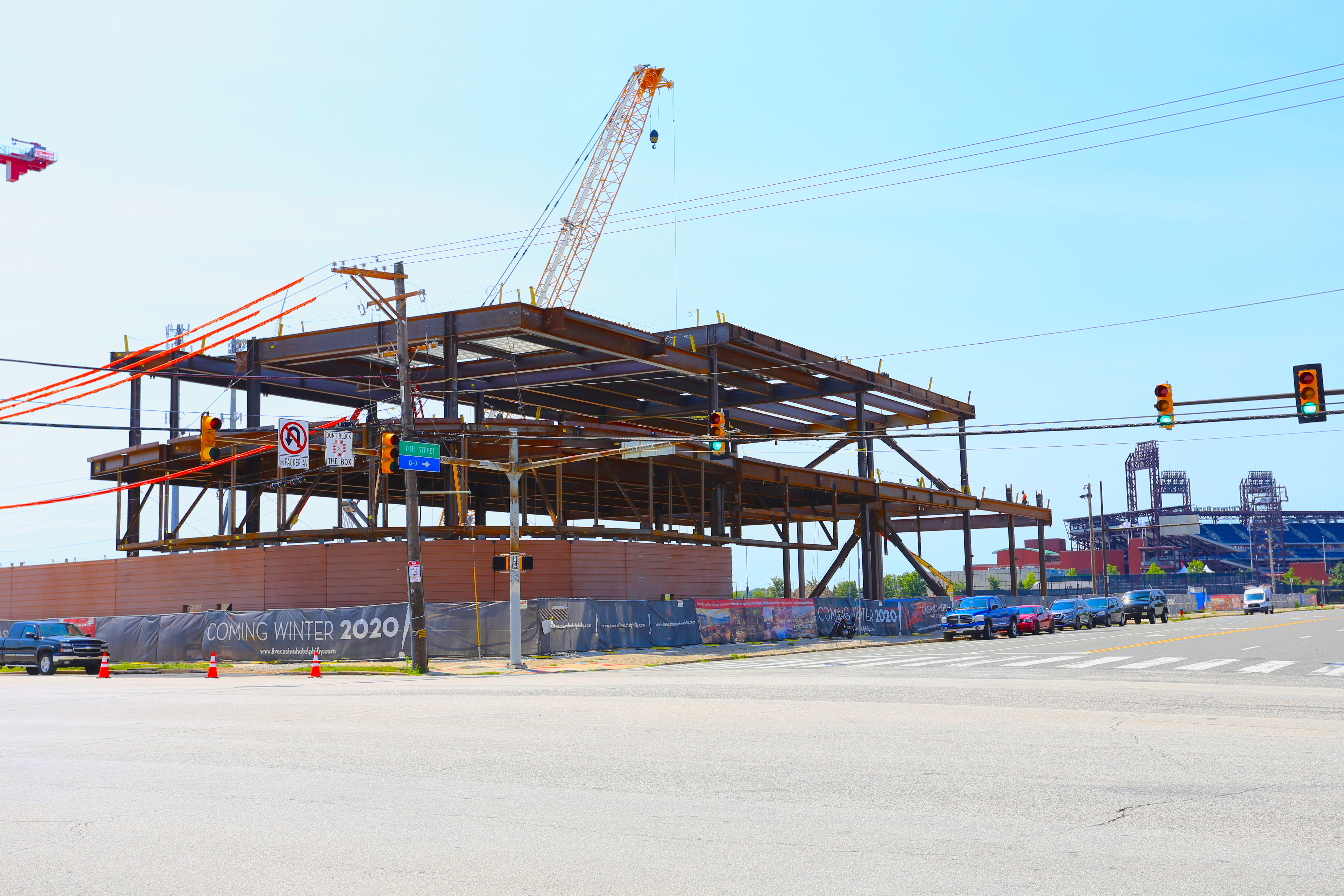 Demolition permits were pulled for the Holiday Inn in April of 2018 and the wrecking ball finally struck in early 2019. The Live! Casino and Hotel has just started rising out of the ground with what looks like 3 stories already above grade. An interesting cladding is beginning to wrap around the first floor. The construction site is gigantic. The pictures that we took today do not reflect the size of this project. Next time you are down at a ball game, check it out for yourself.
