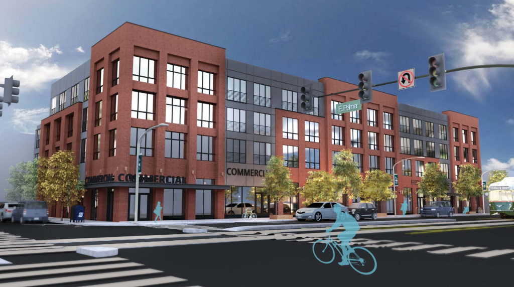 Today, we bring you an even larger project that is rising at Girard and Palmer St. within a qualified opportunity zone. 501-27 E. Girard Ave. is a 26,271 square foot, CMX-2 zoned parcel that was formerly the long-time home of Lou Wolff Auto Sales, which sold used cars. The property included a large parking lot with a detached garage, a commercial building that was used as a dentist office, and an old theater that had been converted into a garage. Those buildings were demolished in late 2017.