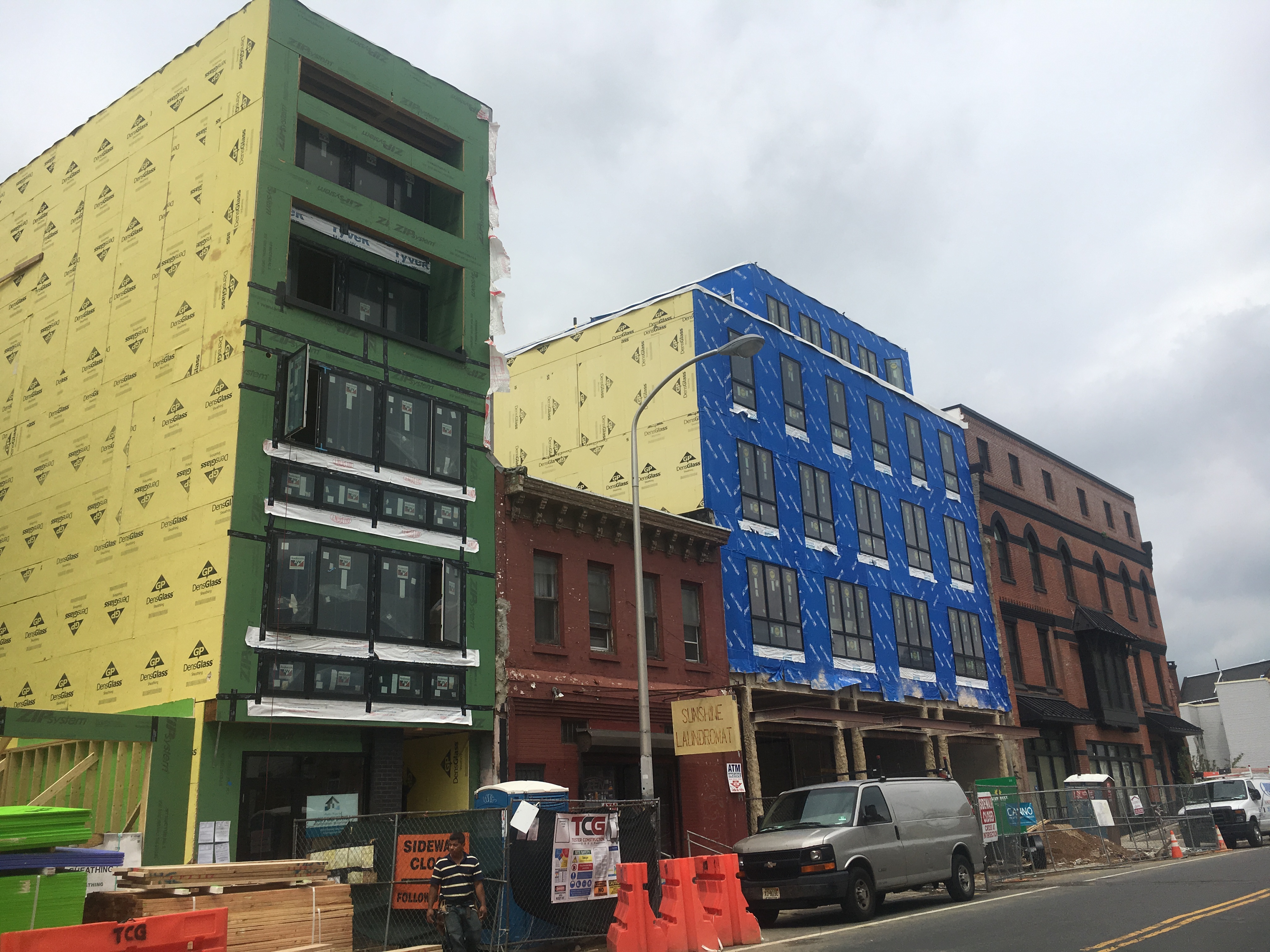 1734-1738 Ridge Ave: This 11,132 square foot, CMX-2.5 zoned parcel once held the Ridge Theater, which was later Frankensteined into a vinyl-covered church and then demolished in 2017. Developers purchased the property in 2012 for $250,000. What a bargain from today’s perspective! The development team secured new construction permits in October of 2017 for the erection of a 5-story building with 30 residential units, ground floor commercial space, 18 car parking spots, and 10 bike spaces. The building has topped out, but is still under construction. A blue moisture barrier is waiting to be covered with a permanent facade material.